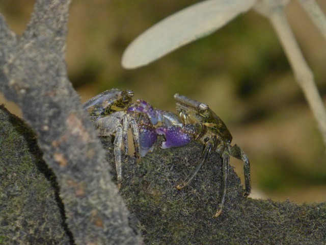 あっ!ノコギリガザミ発見です。マングローブガニとも呼ばれています。マングローブ域の代表選手なんですよ。日中は巣穴の中でのんびりしていることが多いようですが、夕方から夜にかけては活発に活動し始めます。トワイライトやナイトのカヤックツアーの時には、意外と逃げないで、その姿を見せてくれることがあるんです。