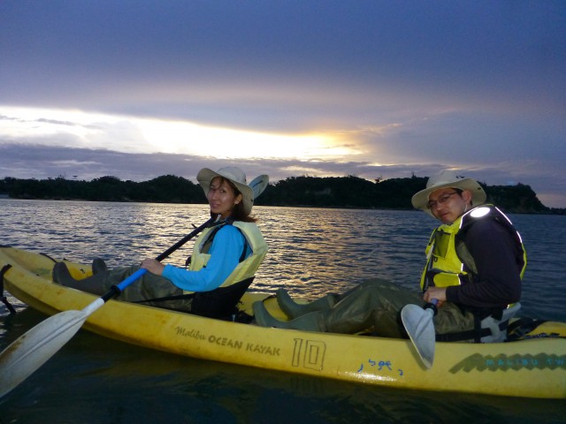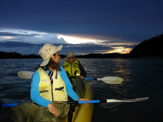 トワイライト(サンセット)カヤックは漕ぎ始めはこんな風に明るいんですよ。時間をおうごとに景色が変わっていきます。