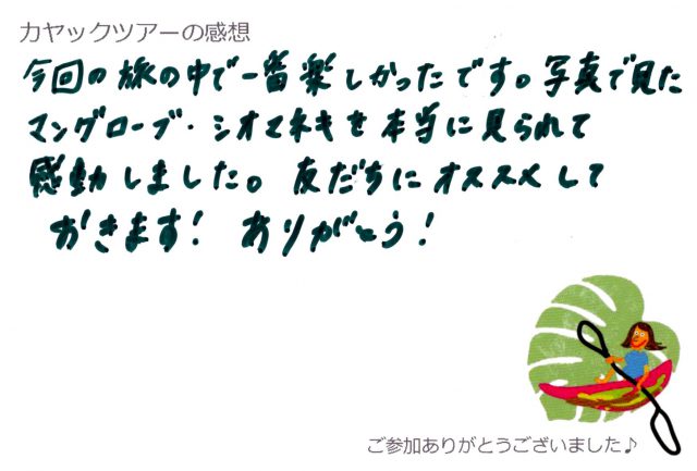 今回の旅の中で一番楽しかったです。写真で見たマングローブ・シオマネキを本当に見られて感動しました。友だちにオススメしておきます!ありがとう!