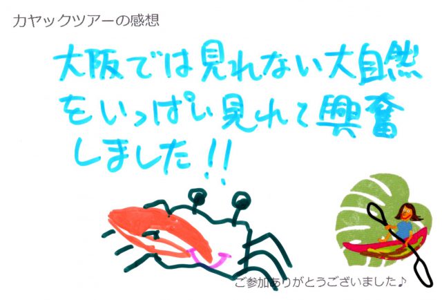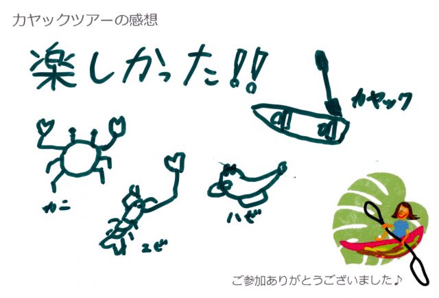 はじめて参加したカヤックツアー!!見るものばかりが、はじめてのものばかりで、勉強にもなってよかった。友だちにも紹介したいぐらい楽しかったです!生きものサイコー!!!ヒロさんダイさん、ありがとうございます!!