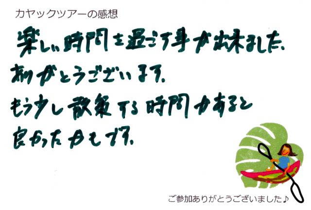 カヤックツアー、とっても楽しかったです。マングローブの事や沖縄の生物のことを沢山教えてもらいました!ガイドのなるさんがすっごくおもしろかったです。またやりたいです。