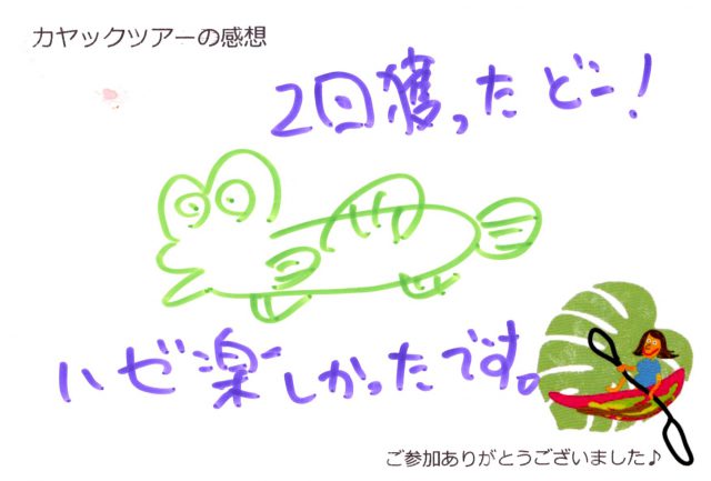 カヤックはじめてのってたのしかった。えびが手をそうじしてくれたからきれいになった。