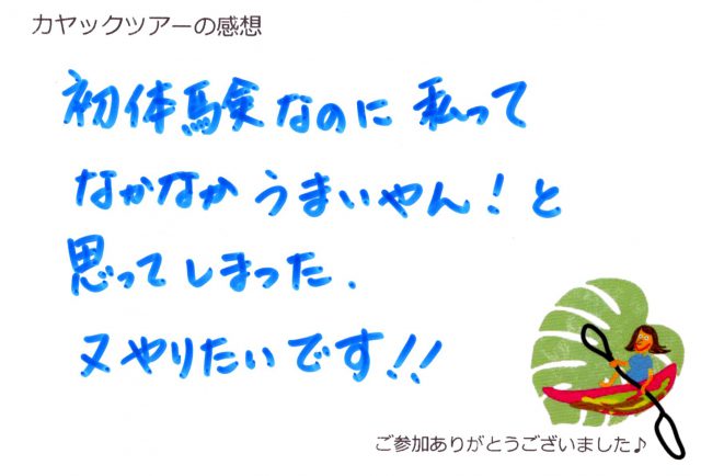 みんなでワイワイ、キャーキャー大騒ぎ!初体験のカヤックもマングローブのいろんなお話もおもしろかったよー。写真もいっぱい撮ってもらったし、、、。また、いつか参加したいナー、ゼッタイ来るゾー♡