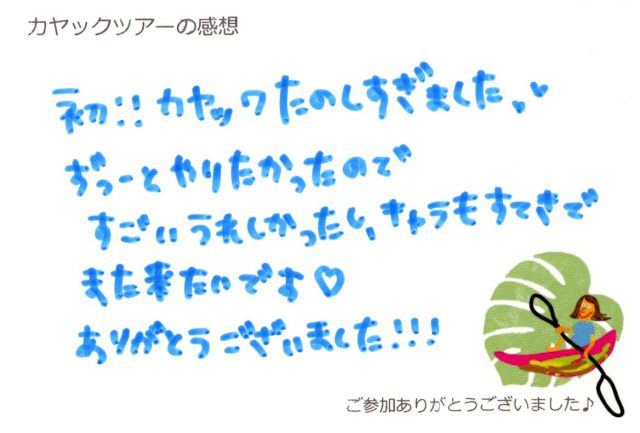 初!!カヤックたのしすぎました♥♥ずーとやりたかったので、すごいうれしかったし、キャラもすてきで、また来たいです♡ありがとうございました!!!