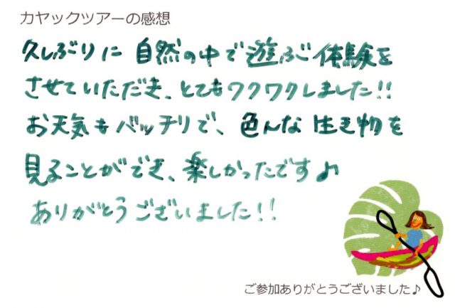 前日までとは違いあたたかい天気で、楽しくカヤックができました!ありがとうございました!!説明も面白くて分かりやすかったです!