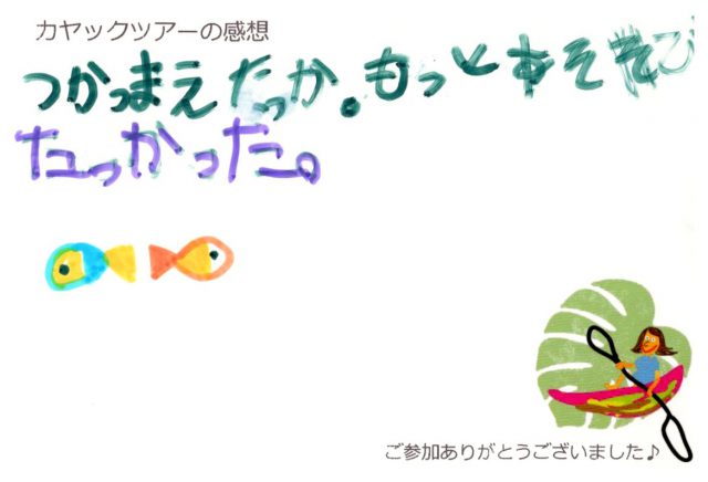 想像以上に楽しかったです。手長エビやハゼをつかまえたり、知らない生きものの事を沢山教えて頂、面白かったです。もっと沢山カヤックこぎたかったです。