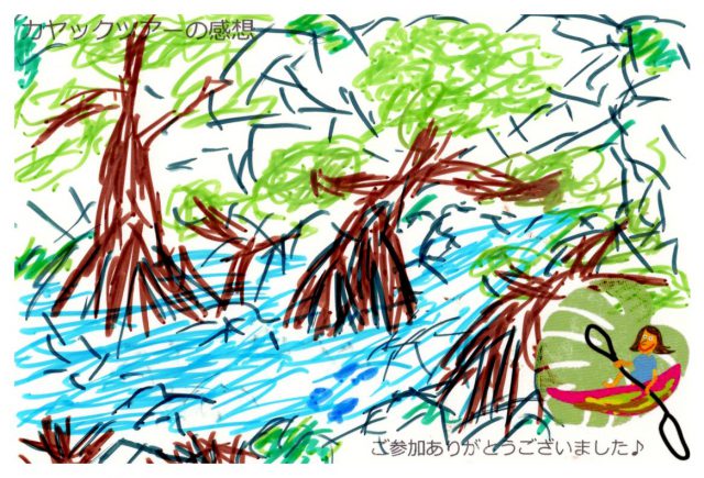 今日は他ではできない貴重な体験ができました。カヤックは操作が難しく、思いがけないことも起きましたが、楽しかったです。また、ガイドではマングローブについて詳しく教えて頂き、意外なこともあって面白かったです。ありがとうございました。