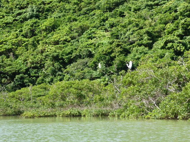 マングローブの上にはサギがとまっています。この時間は潮位が高いので、サギたちは休憩中です。