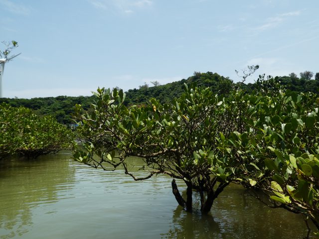 こちらもマングローブです。背が低いメヒルギとオオハマボウという海岸植物があります。後ろ側にもいろいろな植物が控えていますね。