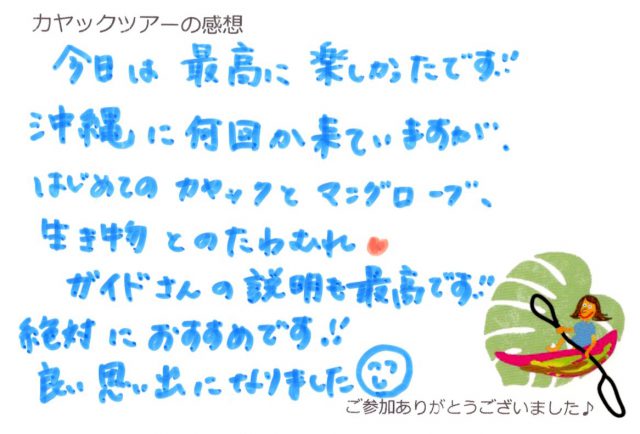 今日は最高に楽しかったです!!沖縄に何回か来ていますが、はじめてのカヤックとマングローブ、生き物とのたわむれ♡ガイドさんの説明も最高です!!絶対におすすめです!!良い想い出になりました☺