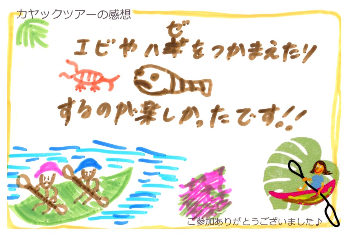 エビとハゼと一緒に遊んだのが一番の思い出です 2021年8月13日 エビとハゼと一緒に遊んだのが一番の思い出です。おったまゲーがたくさんのたくさんのツアーでした。 子供の頃に戻った感じで時間を忘れて楽しめました。先生!勉強になりました!! エビやハゼをつかまえたりするのが楽しかったです!! カヤックをこいだり、エビなどをつかまえたりすることがたのしかったです。