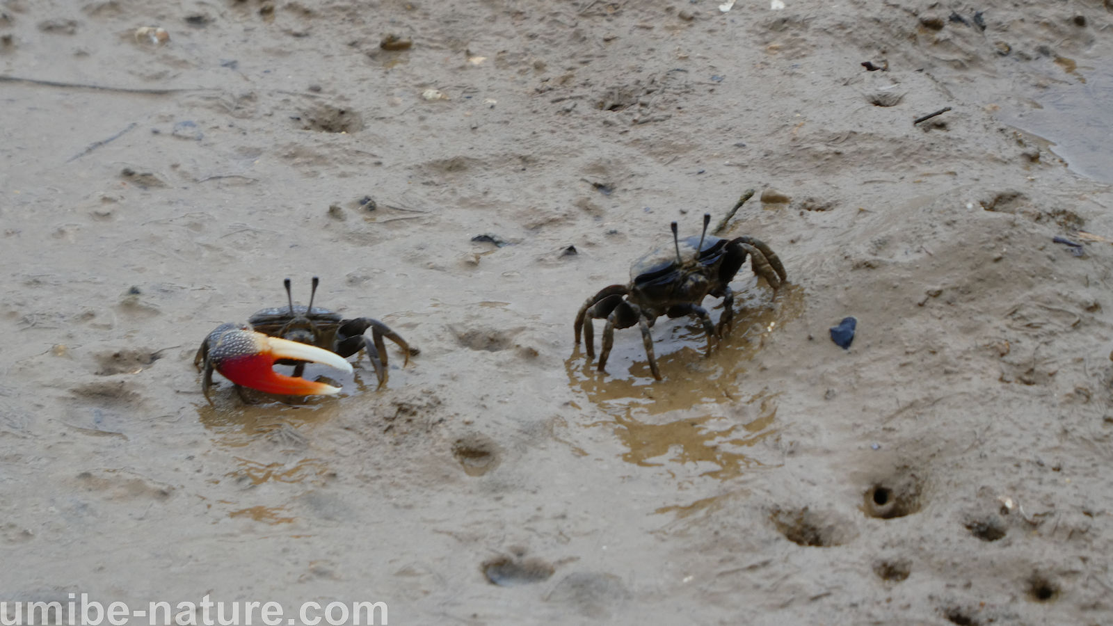 ハサミの下側が赤い色をしているヤエヤマシオマネキです。右の個体は雌です。