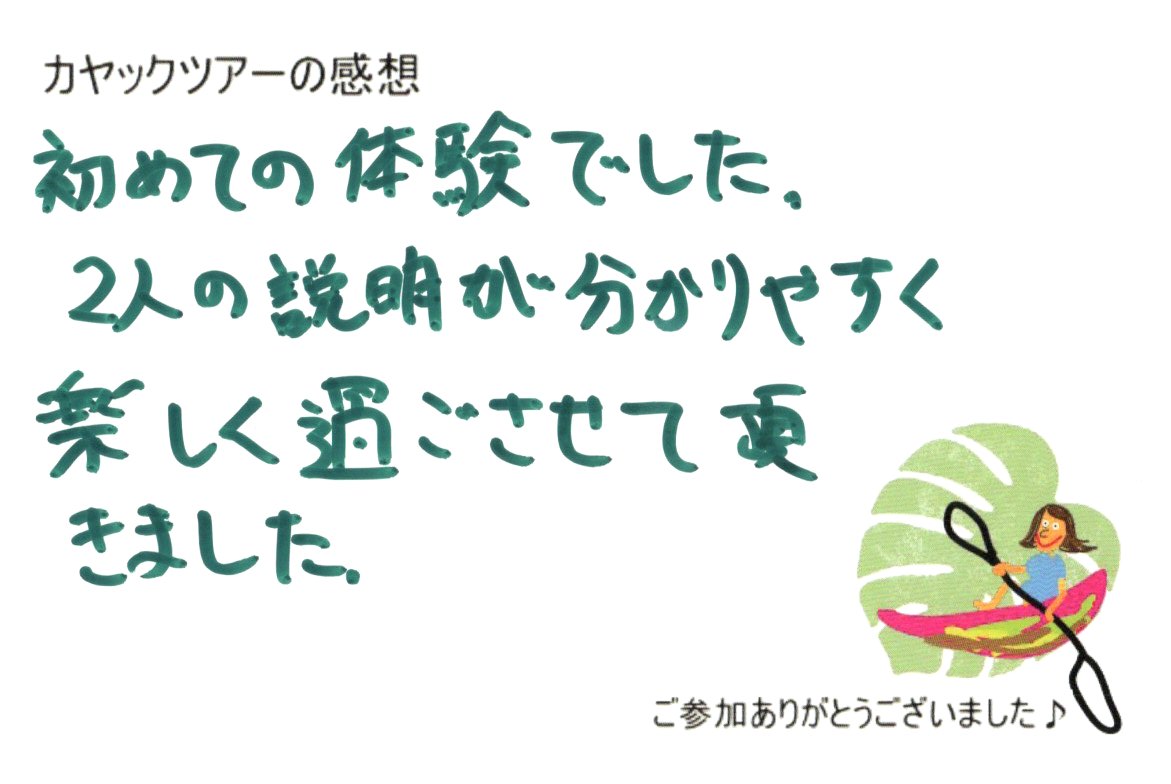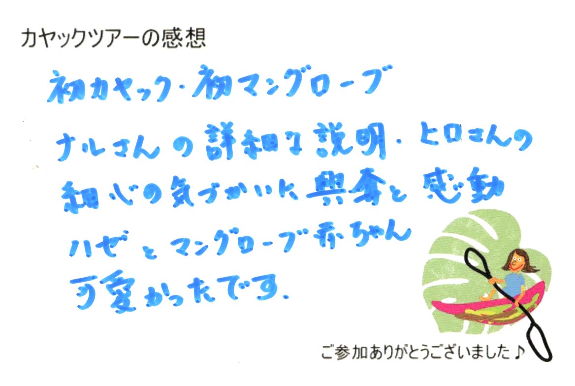 初めての体験でした。 2人の説明が分かりやすく 2026年1月9日午前 初めての体験でした。 2人の説明が分かりやすく楽しく過ごさせて頂きました。 初カヤック・初マングローブ ナルさんの詳細な説明・ヒロさんの細心の気づかいに興奮と感動 ハゼとマングローブ赤ちゃん 可愛かったです。