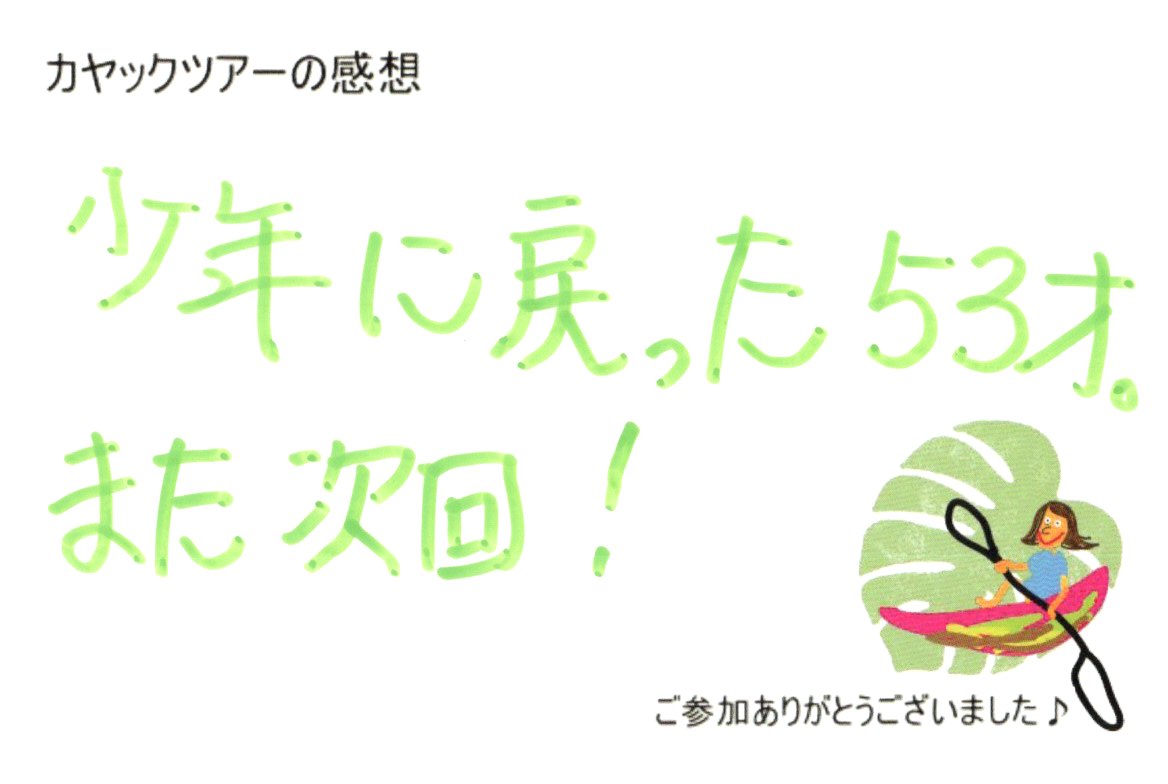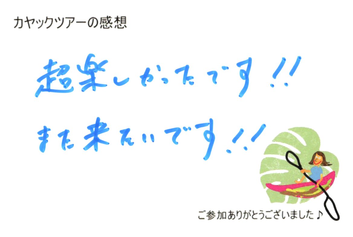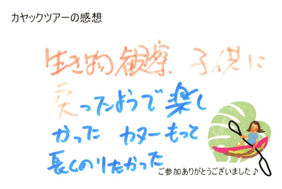 生き物観察、子供に戻ったようで楽しかった 2026年2月15日午前 生き物観察、子供に戻ったようで楽しかった カヌーもっと長くのりたかった 感動した!! 少年に戻った53才。 また次回! 超楽しかったです!! また来たいです!! 楽しかったです。 また参加したい! « マングローブとカヤック楽しめました。最高!! 2025年8月26日 午前 とてもおもしろかったです。ありがとうございました。2026年2月15日午後 »