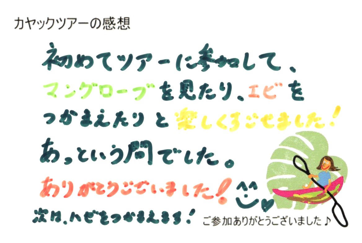 マングローブが圧巻でした!! 2026年2月22日午前 マングローブが圧巻でした!! 初めてツアーに参加して、マングローブを見たり、エビをつかまえたりと楽しくすごせました! あっという間でした。 ありがとうございました! 次はハゼをつかまえます! « とっても楽しかったです! 親切でていねいなガイドを 2026年2月21日 マングローブってすごい!! 2026年2月23日午前 »